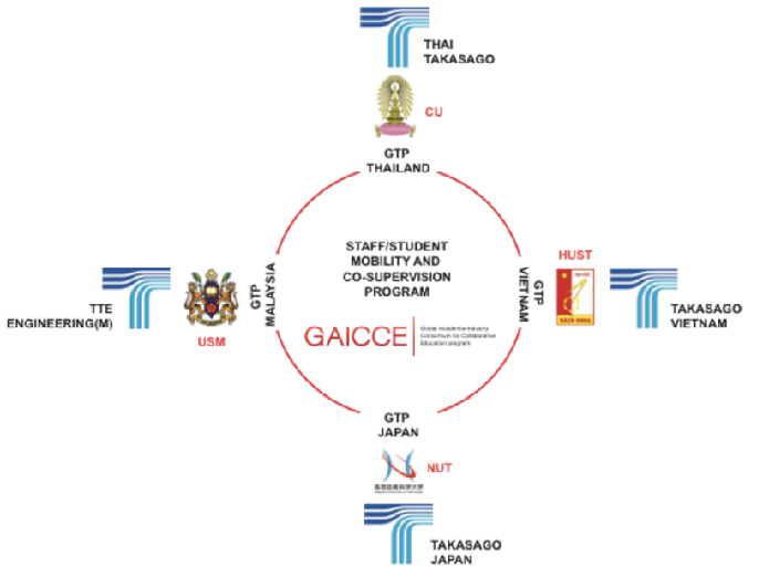 • Promoting Global Academia-Industry Consortium for Collaborative Education (GAICCE) utilizing GIGAKU Techno Park (GTP*) network with CU (facilitator), NUT, HUST, USM, and Takasago Thermal Engineering Co., Ltd