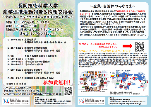 今回の報告会・情報交換会では、本学の海外拠点を結んだ「GIGAKUテクノパーク(GTP)ネットワーク」を活用した国際産学連携活動の中で外国人高度技術者人材を受け入れた実績のある関係企業等から、受入事例などをご紹介いただきます。また、自治体の支援の事例として長岡市の取組についてもご紹介します。