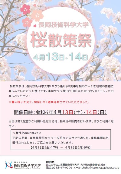 令和6年4月13日(土曜)と14日(日曜)に技大桜散策祭を開催します。※蕾の様子を見て、開催日を1週間延期させていただきました。