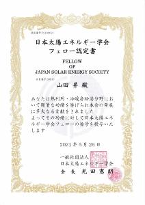 山田昇教授が日本太陽エネルギー学会フェローの称号を授与されました。