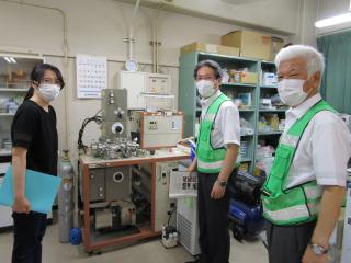 鎌土学長、梅田理事・副学長(総括安全衛生管理者)及び安全衛生管理関係者が安全衛生優良研究室に推薦された2つの研究室を巡視・視察し、研究室内の安全措置等について確認するとともに、各研究室の研究内容や実験装置の説明を受けました。特に、新型コロナウィルス感染症等の対策として、換気設備や密集を防ぎながら学生指導・実験が可能か等を重点的に確認しました。
