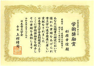 杉原幸信助教が日本雪工学会学術奨励賞を受賞しました。