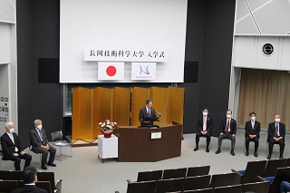 入学許可宣言の後、鎌土学長から新入生に対して、豊かな人間性を磨くと同時に、VOSの精神をもって、新しい分野や学びに積極的に挑戦し、グローバルに活躍する技術者・研究者となることを志して欲しいとの激励とお祝いの言葉が贈られました。