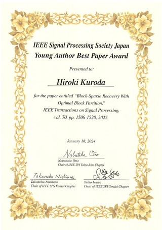 黒田大貴助教が第8回 IEEE Signal Processing Society Japan Young Author Best Paper Awardを受賞しました
