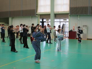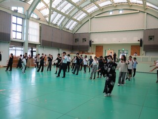 長岡まつりの民踊流しに参加するため、講師の指導のもと、日本人学生、外国人留学生、教職員が練習に励んでいます。異文化交流を深め、地域との絆を強めるこの活動は、参加者全員にとって貴重な経験となっています。