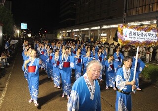 本学の学生・教職員は、今年も市民との交流の一環として、8月1日(木)に行われた長岡まつりの平和祭「大民踊流し」に参加しました。