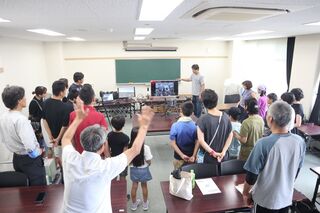 小学生・保護者向けでは、GX棟での研究や取組、クリーンエネルギー、ドローンや計測機器の活用について説明しました。参加者はドローンの機体、バッテリーの重さを体感した後、ドローンのカメラを使用した会場のリアルタイム撮影により3D計測技術について学びました。講義の後、縦渦で駆動する安全な風車の説明や、実際に安全な風車を触る体験・見学が行われました。