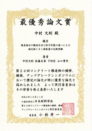 中村文則 准教授・佐藤友希(本学学生)・下村匠 教授・山口貴幸 技術職員が日本材料学会(コンクリート構造物の補修・補強・アップグレード論文報告集)最優秀論文賞を受賞しました