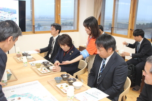 はじめに本学の鎌土学長から、本学の特徴およびものづくり地方都市の持続的発展に向けた取組について説明し、続いて技術科学イノベーション系 小笠原教授からJST共創の場形成支援プログラム(COI-NEXT)に採択された「“コメどころ”新潟地域共創による資源完全循環型バイオコミュニティ拠点」や全国の高専と連携する「発酵を科学するアイデアコンテスト」などの取組を紹介しました。また、本学の研究圃場で栽培し雪室で貯蔵したお米や、コンテストで評価の高かった発酵食品をご試食いただきました。