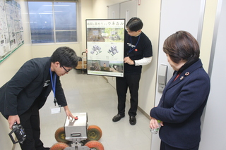 小笠原教授(写真左)から説明を受けるあべ大臣(写真奥右)、池田産業連携・地域振興課長(写真奥左)