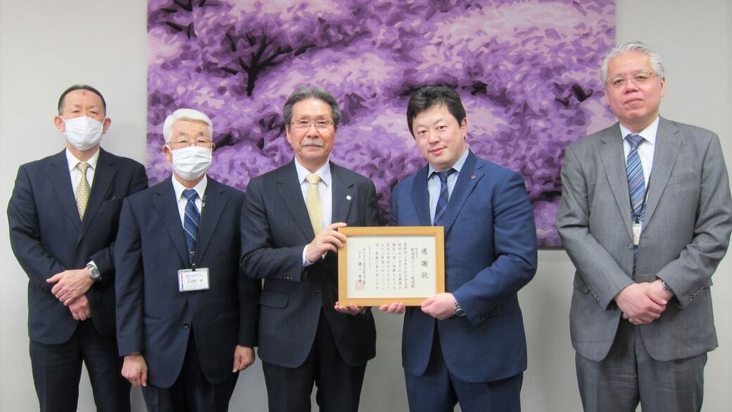 一般財団法人新潟県けんこう財団様より開学50周年記念事業基金へご寄附を頂戴したことに感謝の意を表すため、鎌土重晴学長から同財団の入澤孝昌理事長へ感謝状を贈呈いたしました。