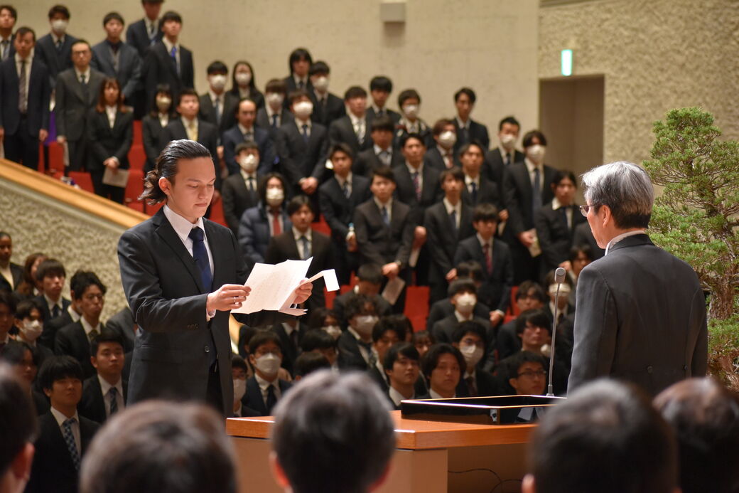引き続き、入学生を代表して、学部第3学年情報・経営システム工学分野の山本真さんが宣誓を行いました。