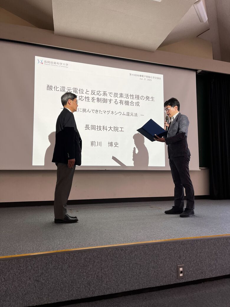 物質生物系 前川博史教授が、令和7年度有機電子移動化学学術賞を受賞しました。有機電子移動化学学術賞は、有機電子移動化学および有機電子移動化学研究会の進歩発展に貢献し、優れた研究を行った者に贈られます。授賞式は、6月27日に第49回有機電子移動化学討論会(電気通信大学)において行われました。
