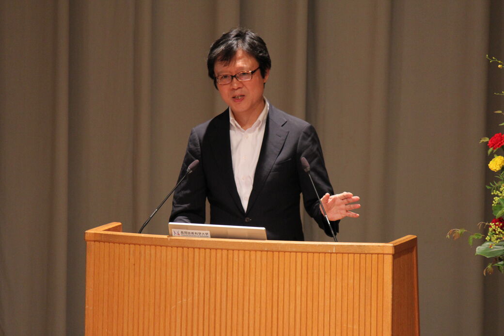 本学では、本事業により、社会のサスティナビリティと大学のサスティナビリティを共に進める世界トップレベルの「ソーシャルインパクト創出型のSX研究大学」を目指すこととしており、シンポジウムでは、開会挨拶で鎌土重晴学長より、本事業への期待と構想の実現に向けた抱負が述べられました。続く来賓挨拶では、長岡市の磯田達伸市長、日本学術振興会の杉野剛理事長、文部科学省の井上諭一科学技術・学術政策局長及び日本銀行新潟支店の平形尚久支店長より、本学に対する期待や、激励の言葉が贈られました。その後、中山忠親特命副学長より、事業概要の説明があり、本事業のビジョンや、具体的な計画について共有されました。