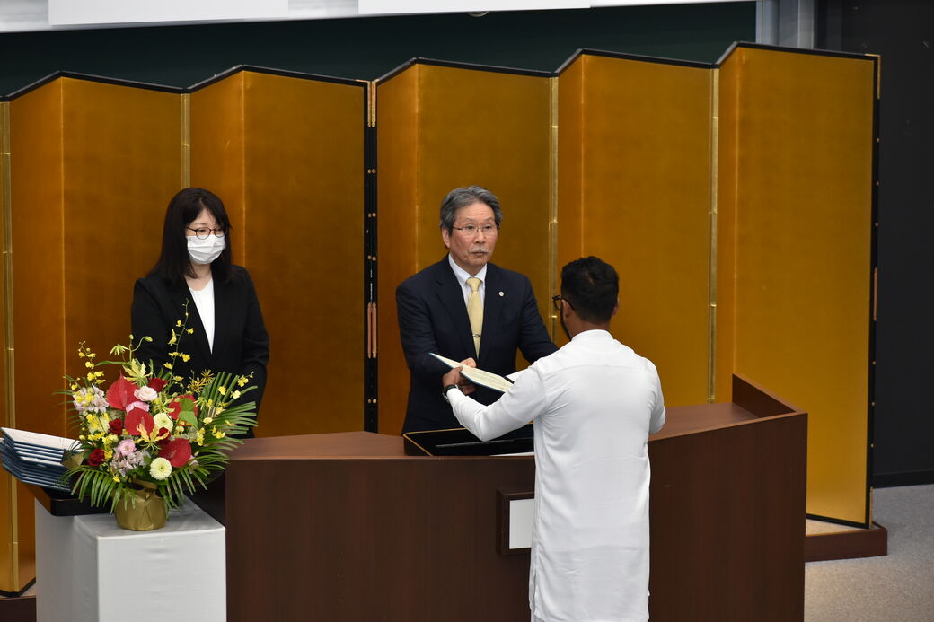 また、学生表彰も併せて行われ、学業の成績優秀者3名に、鎌土学長から表彰状及び記念品が贈られました。