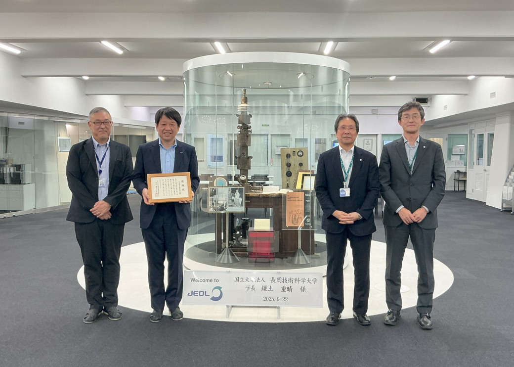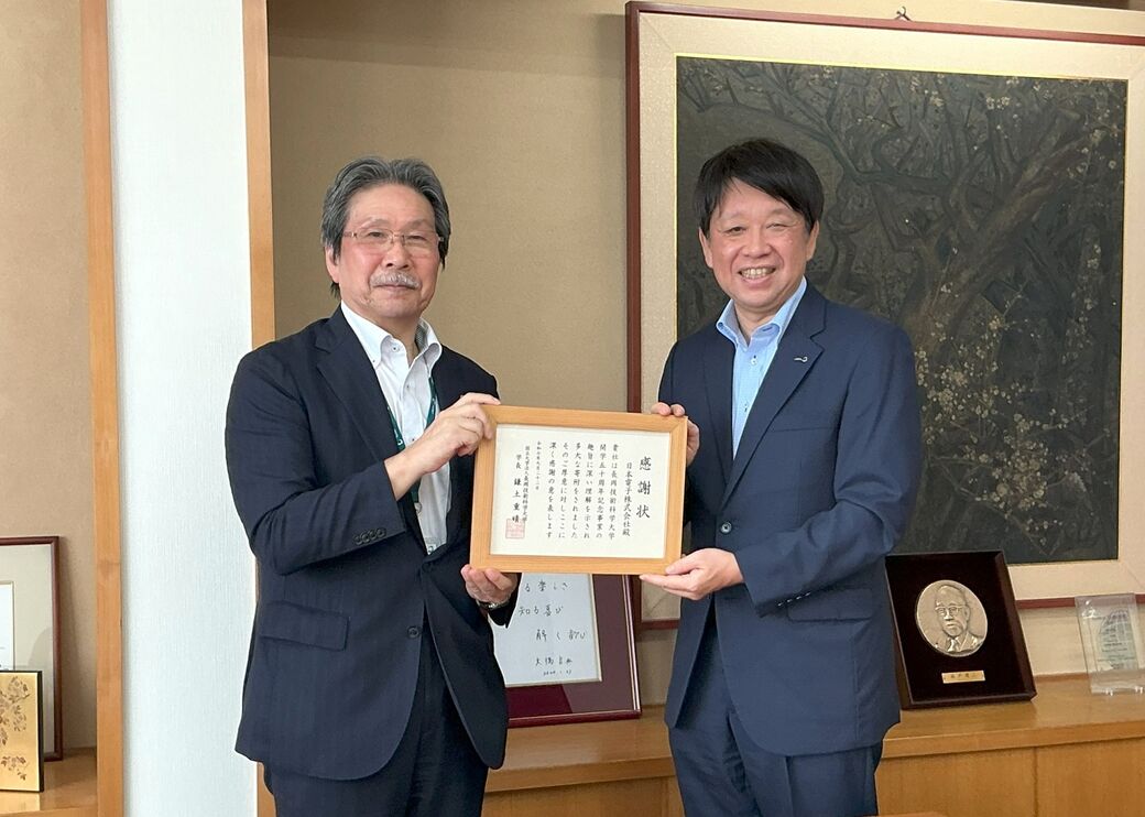 日本電子株式会社様より開学50周年記念事業基金へご寄附を頂戴したことに感謝の意を表すため、鎌土重晴学長、武田雅敏理事・副学長が同社を訪問し、大井 泉代表取締役社長兼CEOに感謝状を贈呈しました。