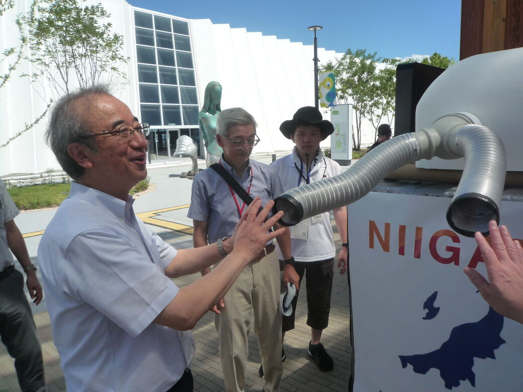 7月13日オープニングセレモニーに先立ち、花角英世新潟県知事が長岡技術科学大学関係の展示「バイオランドリー(ユニット型ウォーターチェンジャー®)」と「雪風君」を視察。地域防災実践研究センターの三浦センター長と吉澤客員教授の説明のもと、20分ほど意見交換が行われました。