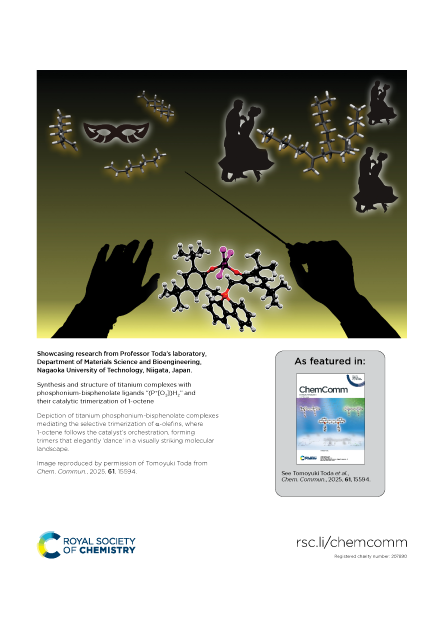 本学技学研究院物質生物系の戸田智之助教らの研究グループは、新たに独自設計したチタン錯体触媒を開発し、1-オクテンという小さな分子を「選択的に3つつなげる(トリマー化注3)」反応を実証しました。これまで、重合反応では分子の長さや形を思い通りに制御するのは難しいとされてきましたが、本研究により狙った長さに選択的に合成できる新しい道が開かれたことになります。今回の成果は学術誌 Chemical Communications に掲載され、論文の図が同誌の外側裏表紙(outside back cover)に採用されました。