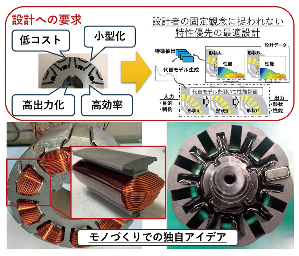 私の研究室では、図1に示すように情報科学と電力工学を融合し、モータのモノづくりを抜本的に変える取組を行っております。AIやスーパーコンピュータなど、情報科学技術の発展は目まぐるしく、ChatGPTで学習効率を上げる器用な学生も多くなってきました。我々教員としては非常に危機感を覚えるところですが、こういった有用なツールは使わない手はないと考えています。モータは、モノづくりありきで最適設計を考える慣習が強いですが、私の研究ではどう造るかを考えて設計するのではなく、性能重視の最適設計を追求し、それを実現するモノづくりを考えるアプローチを目指しています。そのため、設計の初期段階では、モノづくりは度外視し、数値最適化やAIなどを活用し、出力・効率などスペックのみに着目した最適設計を行います。もちろん、ここで研究を終えてはただの自己満足です。図2のように、次のステップでは得られた最適設計を実現するための、モノづくりのアイデアを学生と一緒に考えます。これまでにも、独自の構造アイデアを提案し、積極的に学会等で公表してきました。私自身、前職が電機メーカで製造の最前線を経験してきました。モノづくりの現状を知り、提案するアイデアの実現可能性についても、検討に手を抜きません。