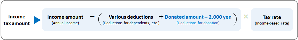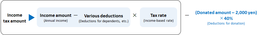 For donations exceeding 2,000 yen, the donated amount minus 2,000 yen can be deducted from that year’s income. However, this is limited to an amount that does not exceed 40% of the donor’s gross income.