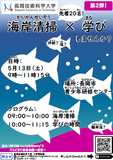 5月13日(土曜)に市民の皆様へのSDGs普及を目指した活動の一環として、長岡市青少年研修センターにおいて、下記の通り「海岸清掃×学び」を行います。皆様からのご参加をお待ちしております。