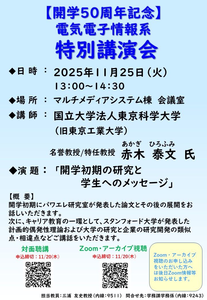 この度、開学50周年を記念して電気電子情報系特別講演会を開催することとなりましたので次の通りご案内いたします。