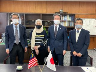 令和3年4月9日(金曜)マレーシア大使館ハルティニ参事官が来学されました。この訪問は、ツイニング・プログラムにより本学に在籍しているマレーシア人留学生の激励や、コロナ禍における生活のヒアリングを目的として実施され、本学に在籍するマレーシア人留学生の内、9名が参加しました。