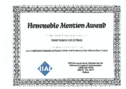 受賞の対象となった論文は「Topic model based Estimation of Passive Twitter-User’s Interests from Followed Users’ Tweets」です。10th IIAI International Congress on Advanced Applied Informatics情報科学のあらゆる側面(理論、応用、ツール)に関する実験、新たなアイデア、研究成果を共有する学際的な国際会議であり、は7月11日から16日にオンラインで開催されました。本賞は、査読結果が上位の論文に対して授与されます。