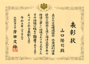 第16回海洋立国推進功労者内閣総理大臣表彰を、山口隆司教授が受賞しました。