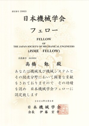 機械系 高橋勉教授が、日本機械学会フェローに認定されました。