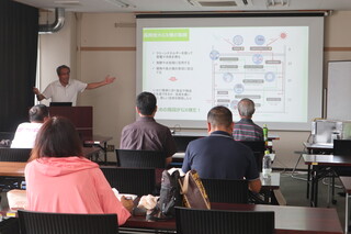 一般・同窓生向けでは、小学生・保護者向けと同様に、GX棟での研究や取組、クリーンエネルギーについての説明後、GX棟で活用する雪室、雪冷熱の利活用に関する説明を行いました。また、会場では雪室のデモンストレーションが行われ、参加者は雪冷房を体験しました。講義の後、縦渦で駆動する安全な風車の説明を行いました。