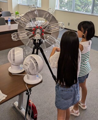小学生・保護者向けでは、GX棟での研究や取組、クリーンエネルギー、ドローンや計測機器の活用について説明しました。参加者はドローンの機体、バッテリーの重さを体感した後、ドローンのカメラを使用した会場のリアルタイム撮影により3D計測技術について学びました。講義の後、縦渦で駆動する安全な風車の説明や、実際に安全な風車を触る体験・見学が行われました。