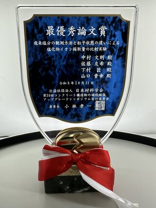 中村文則 准教授・佐藤友希(本学学生)・下村匠 教授・山口貴幸 技術職員が日本材料学会(コンクリート構造物の補修・補強・アップグレード論文報告集)最優秀論文賞を受賞しました