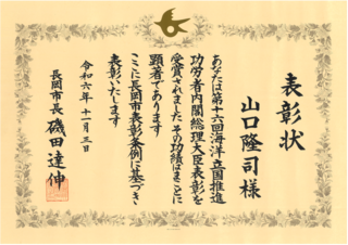 技術科学イノベーション系山口隆司教授が、第16回海洋立国推進功労者内閣総理大臣表彰を受賞した功績により長岡市表彰を受賞しました。