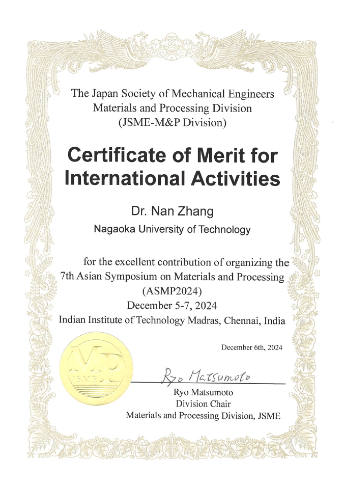 ZHANG Nan助教が日本機械学会機械材料・材料加工部門表彰(国際貢献部門)を受賞しました