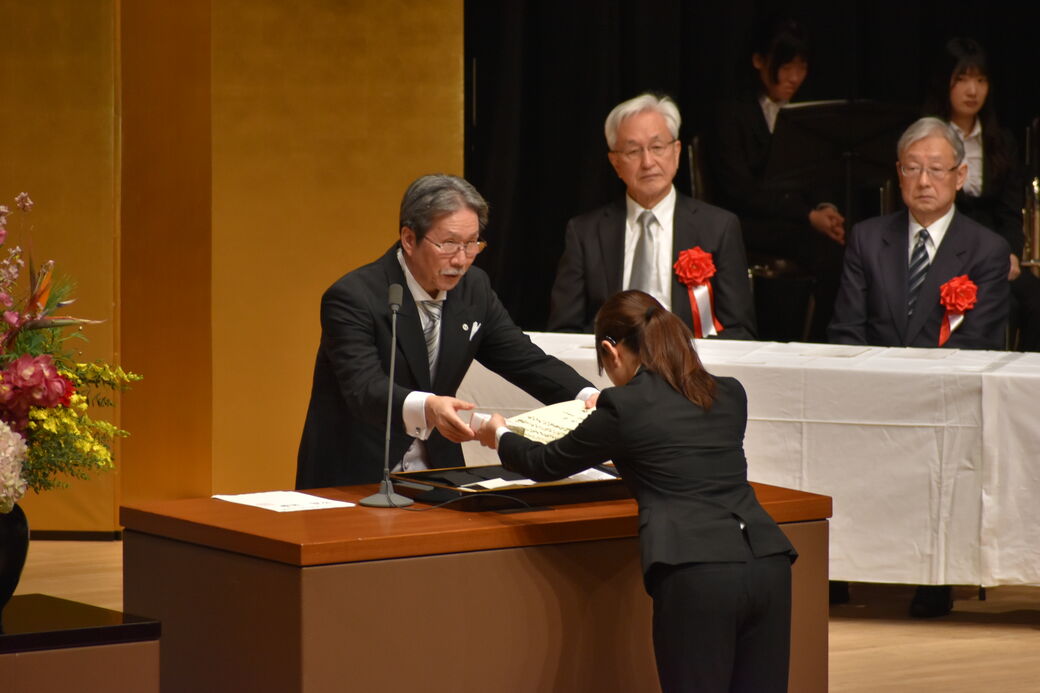 また、学生表彰も併せて行われ、学業の成績優秀者18名に、鎌土学長から表彰状及び記念品が贈られました。