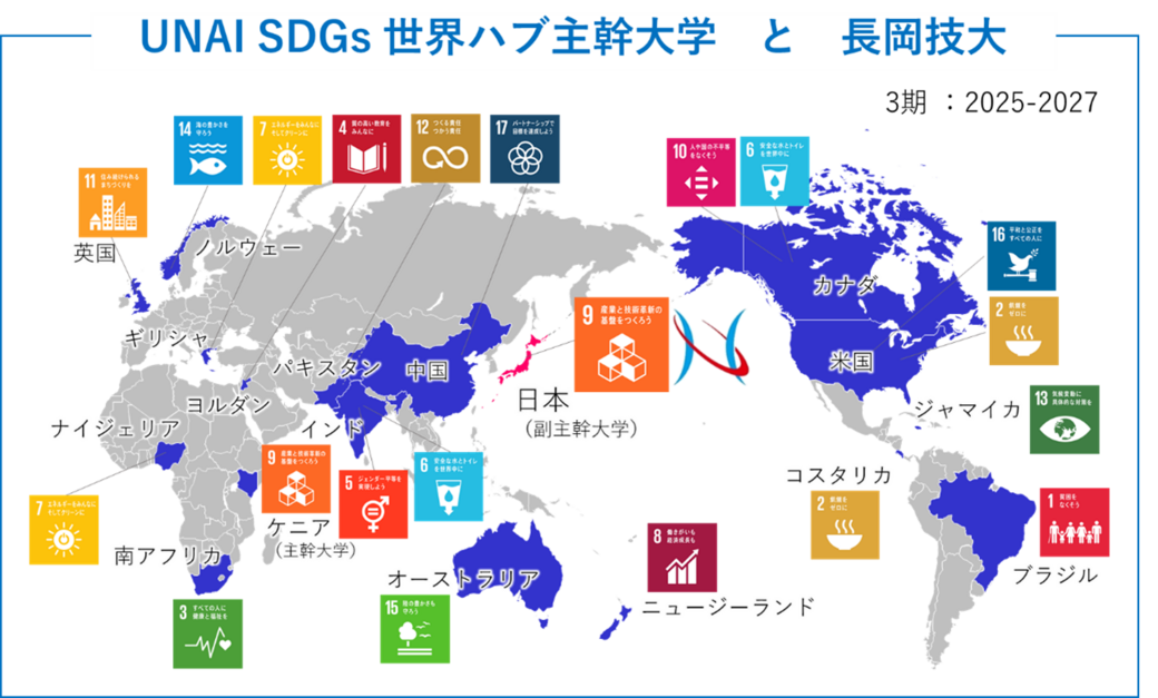 この度、第三期(2025年~2027年)のSDG9ハブ大学として、国連から再び任命されることが正式に決まりました。第三期では、これまでの1ゴール1大学体制ではなく、各ゴールに複数の大学がUNAI SDGハブ大学として任命されます。1つのゴールにはChair(主幹大学)と3つのVice-Chair(副主幹大学:指導と教育、研究、社会連携)が選ばれ、本学はゴール9のハブ大学(研究担当)として選出されました。