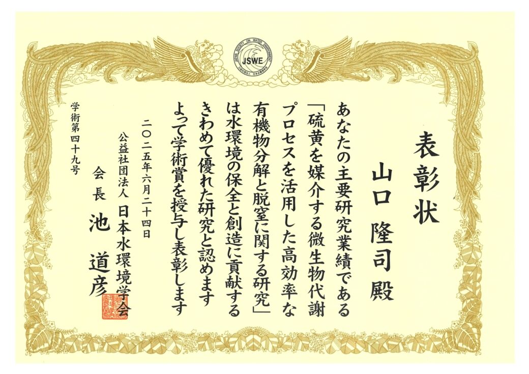 日本水環境学会2024年度学術賞を技術科学イノベーション系 山口隆司教授が受賞しました