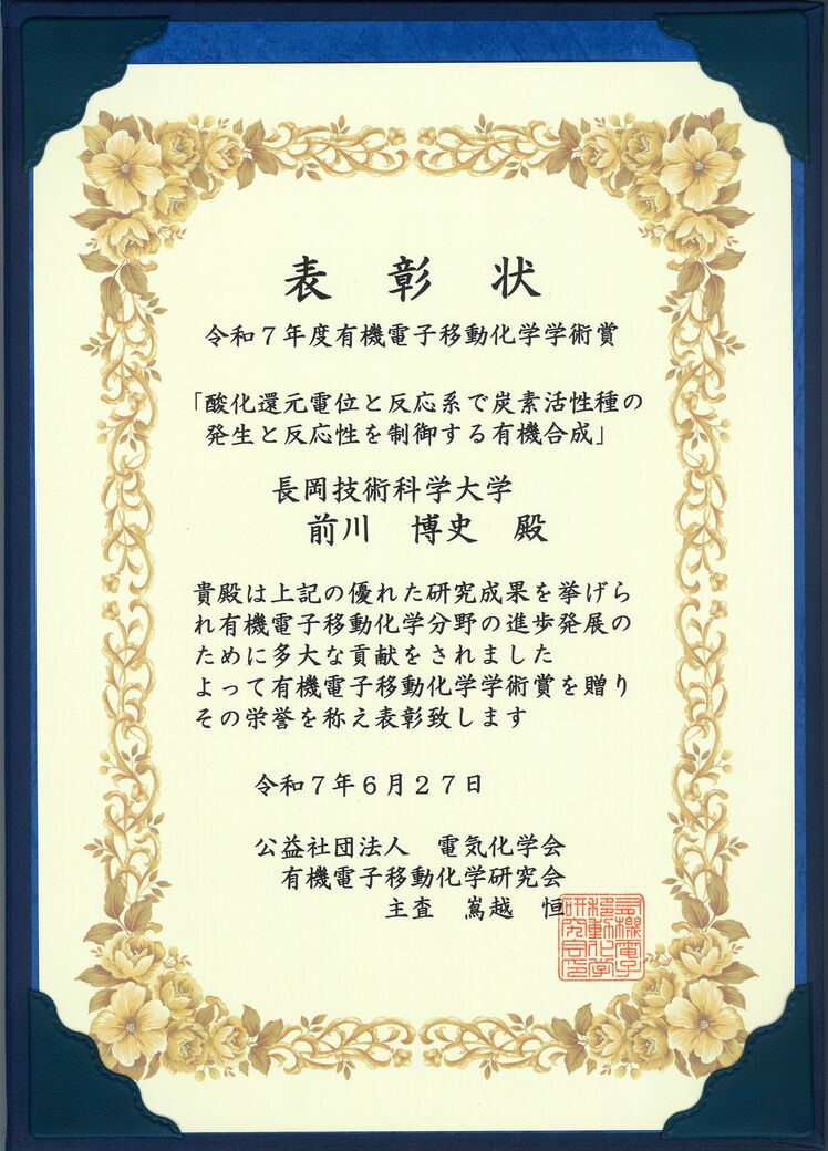前川博史教授が令和7年度有機電子移動化学学術賞を受賞しました