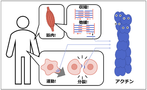 筋肉の主要構成成分として発見された後、動物・植物・酵母などあらゆる真核細胞に存在することが分かっています。筋収縮だけでなく、細胞分裂時の収縮環形成、細胞の変形・移動、細胞内輸送、核内構造の維持や転写制御など、きわめて多様な生命現象に関与する、生命に必須のタンパク質です。