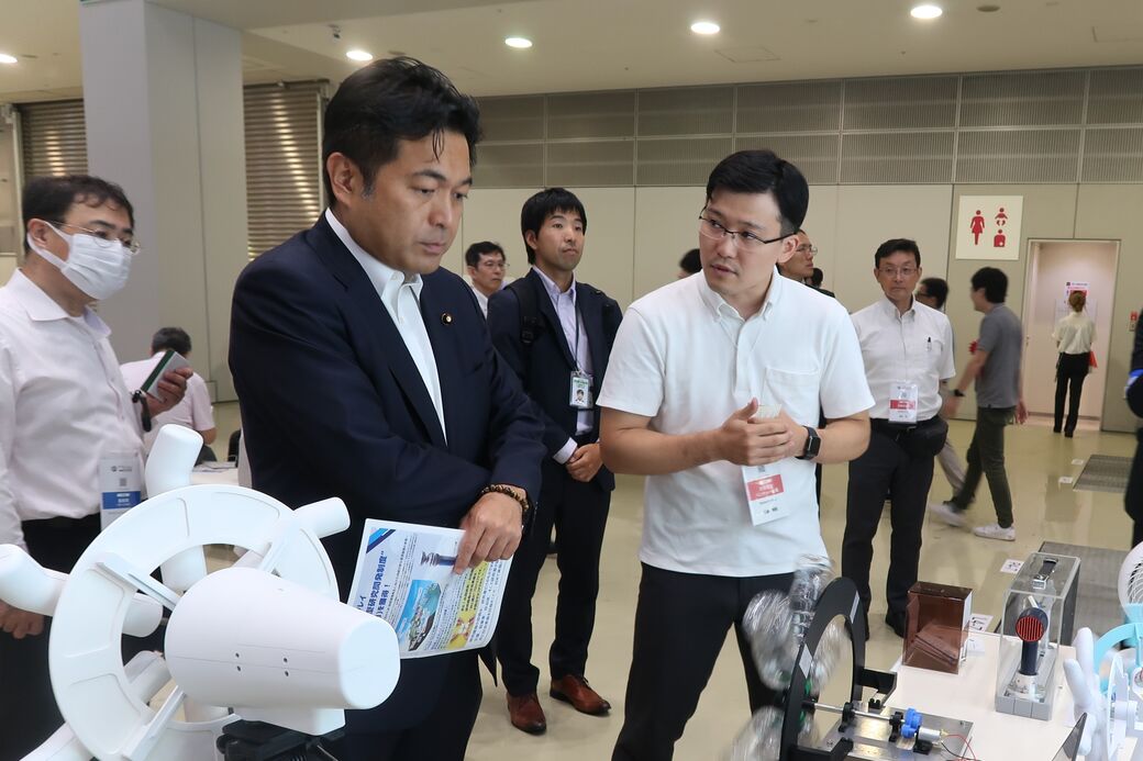 21日には文部科学副大臣の野中 厚氏がご来訪され、佐藤 靖徳代表取締役(本学 客員准教授)の説明に熱心に耳を傾けられました。