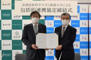 本学において行われた締結式では、東信彦学長と牛木辰男学長が協定書を交わしました。挨拶で本学の東学長は「新潟大学の長年培ってこられた学術研究や、これまでのご経験を踏まえ、知見の深いアドバイスをいただき、自治体や地域が抱えている課題の解決を共に行い、地域貢献と地域産業の活性化を図っていきたい」と述べ、新潟大学の牛木学長は、「災害・復興科学研究所における取組や農学部における災害食研究、新潟大学医歯学総合病院における災害発生時の医療体制の充実など、総合大学としての強みを活かした取り組みを進めながら、長岡技術科学大学と様々な活動において連携することにより、これまで以上に地域の防災・減災の取組や人材育成などに貢献していきたい」と述べました。