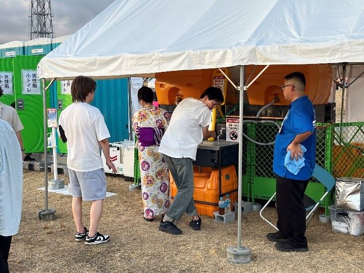 会場では手洗い用水の需要のほか、猛暑のためタオルを濡らす利用者も多く、非接触で利用できる流水設備は快適さと衛生面で好評をいただきました。