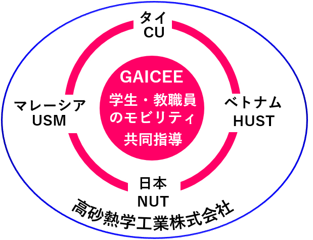 - 本学のGTP事業※を活用した「Global Academia-Industry Consortium for Collaborative Education(GAICCE:共同教育のためのグローバル産学コンソーシアム)プログラム」構想を、チュラロンコン大学(CU)をファシリテーターとして、本学(NUT)・ハノイ工科大学(HUST)・マレーシア科学大学(USM)・高砂熱学工業株式会社と共同で促進