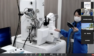 zoomを用いて、本学の走査電子顕微鏡(Hitachi/FlexSEM 1000 II)と透過電子顕微鏡(Hitachi/HT7700)の完全遠隔および半遠隔デモを高橋技術専門職員と小杉技術職員の補佐のもと披露しました。
